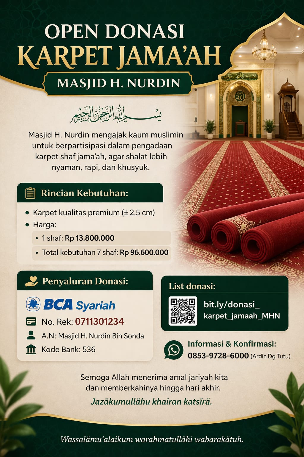 “Masjid H. Nurdin mengajak kaum muslimin untuk berpartisipasi dalam pengadaan karpet shaf jama’ah, agar shalat lebih nyaman, rapi, dan khusyuk.